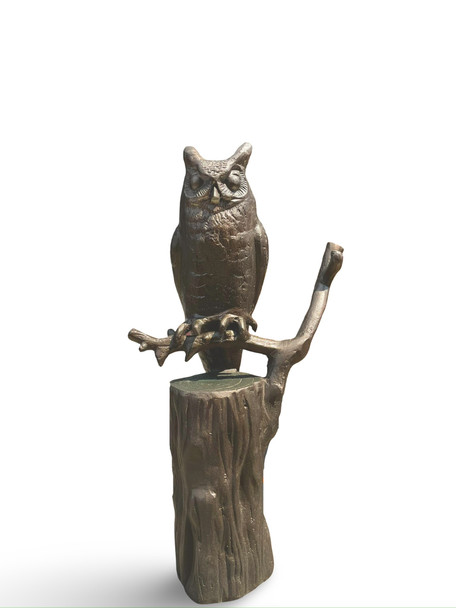This finely detailed Horned Owl sculpture would make a great center piece. Placed on a decorative tree pedestal base it will be the focus of any room. 24"W x 40"H, Weighs approx. 30 lbs. This perched owl statue features clean lines in the wings and a sleek base for a gorgeous display. Painted finely by an artist with four coats of outdoor rated sculpture paint and a finish lacquer. Cast aluminum is environmentally safe and produced under Green America environmentally safe standards and following fair trade standards of production and social consciousness. Each piece is poured in a clay mold and carefully welded together by artisans. Then, the outer shell is polished, and hand painted and finished to resemble bronze. It has a protective layer to withstand weather elements for years. We produce a number of our own pieces in house and team up with two other families to fulfill our production commitments.