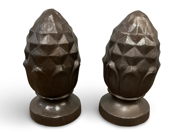 A set of 2 decorative Pine Cone Finials is the perfect complement to top off a 4" diameter round post or pillar. Help give your signage a true outdoors flavor with this unique design. Available in antique bronze finish. Garden decorative vintage classic architectural accent. Multiple pairs discounts available.
